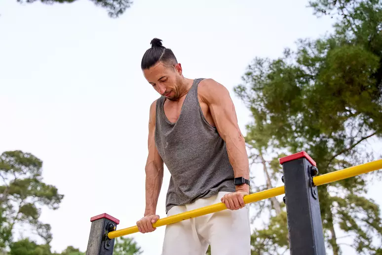 (Imagem de uma pessoa treinando com determinação, reforçando a importância da motivação. Texto alternativo: “Homem treinando sobe uma barra fixa com foco e determinação para manter uma vida ativa.”)