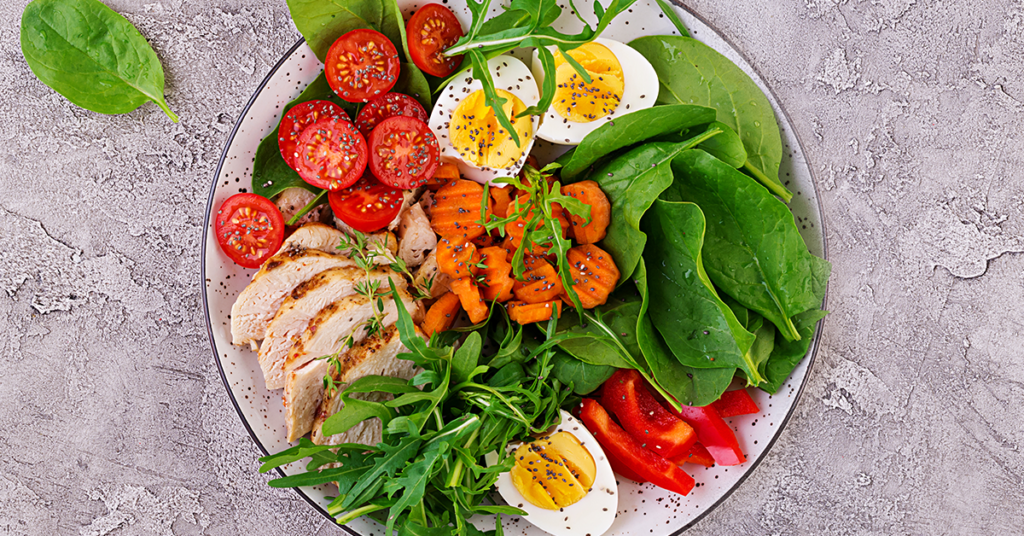 (Imagem ilustrativa de uma refeição saudável, incentivando boas escolhas alimentares. Texto alternativo: “Prato equilibrado com folhas verdes, frango e legumes para uma vida ativa e saudável.”)